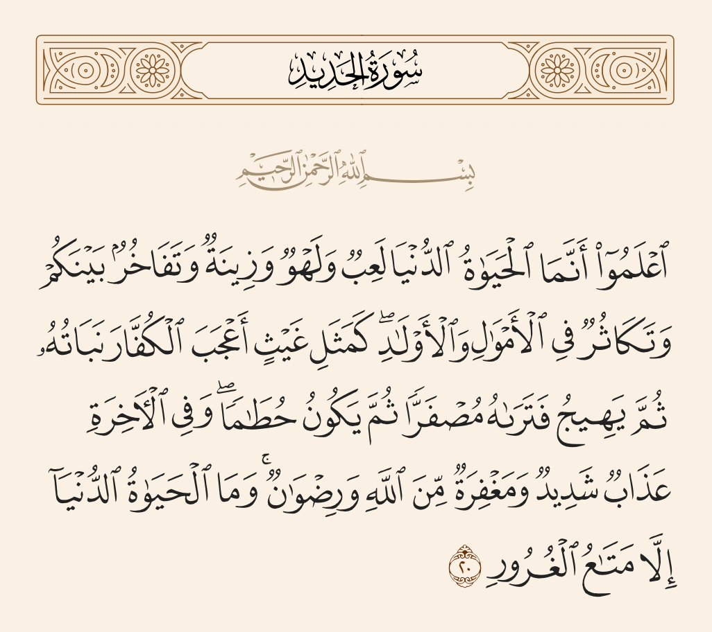 قال تعالى: {اعْلَمُوا أَنَّمَا الْحَيَاةُ الدُّنْيَا لَعِبٌ وَلَهْوٌ وَزِينَةٌ وَتَفَاخُرٌ بَيْنَكُمْ وَتَكَاثُرٌ فِي الْأَمْوَالِ وَالْأَوْلَادِ كَمَثَلِ غَيْثٍ أَعْجَبَ الْكُفَّارَ نَبَاتُهُ ثُمَّ يَهِيجُ فَتَرَاهُ مُصْفَرًّا ثُمَّ يَكُونُ حُطَامًا وَفِي الْآخِرَةِ عَذَابٌ شَدِيدٌ وَمَغْفِرَةٌ مِنَ اللَّهِ وَرِضْوَانٌ وَمَا الْحَيَاةُ الدُّنْيَا إِلَّا مَتَاعُ الْغُرُورِ } [الحديد: 20].