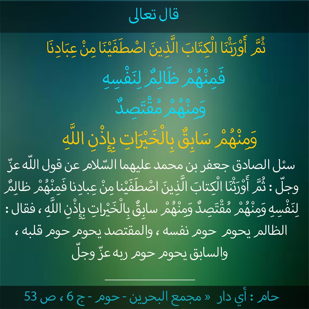سئل الصادق جعفر بن محمد عليهما السّلام عن قول اللّه عزّ وجلّ : ثُمَّ أَوْرَثْنَا الْكِتابَ الَّذِينَ اصْطَفَيْنا مِنْ عِبادِنا فَمِنْهُمْ ظالِمٌ لِنَفْسِهِ وَمِنْهُمْ مُقْتَصِدٌ وَمِنْهُمْ سابِقٌ بِالْخَيْراتِ بِإِذْنِ اللَّهِ ، فقال : « الظالم يحوم « 1 » حوم نفسه ، والمقتصد يحوم حوم قلبه ، والسابق يحوم حوم ربه عزّ وجلّ » .