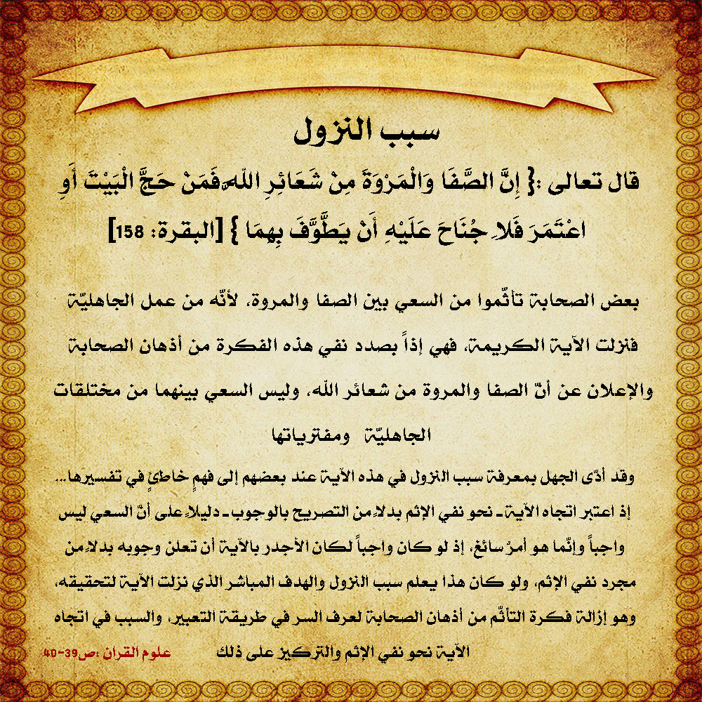 سبب النزول { إِنَّ الصَّفَا وَالْمَرْوَةَ مِنْ شَعَائِرِ اللَّهِ فَمَنْ حَجَّ الْبَيْتَ أَوِ اعْتَمَرَ فَلَا جُنَاحَ عَلَيْهِ أَنْ يَطَّوَّفَ بِهِمَا } [البقرة: 158]