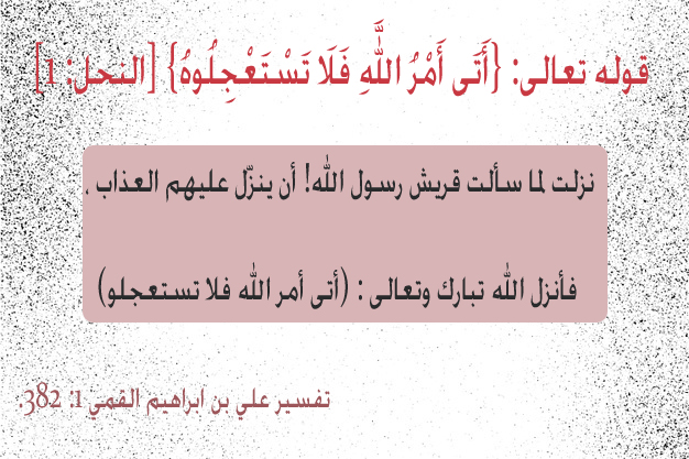 نزلت لما سألت قريش رسول الله! أن ينزّل عليهم العذاب ، فأنزل الله تبارك وتعالى : (أتى أمر الله فلا تستعجلوه)
