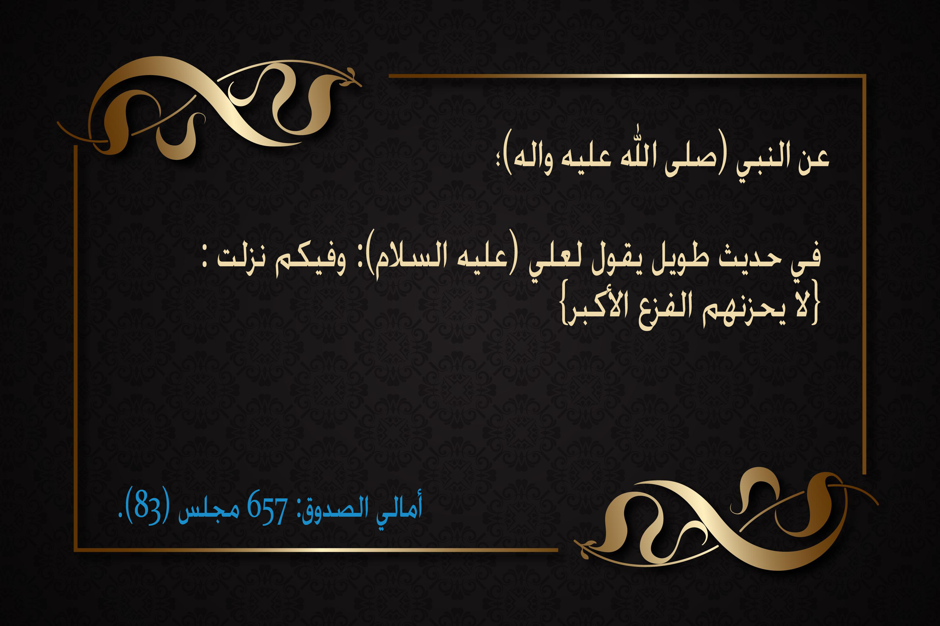 عن النبي (صلى الله عليه واله)؛ في حديث طويل يقول لعلي (عليه السلام): وفيكم نزلت : {لا يحزنهم الفزع الأكبر}(1).