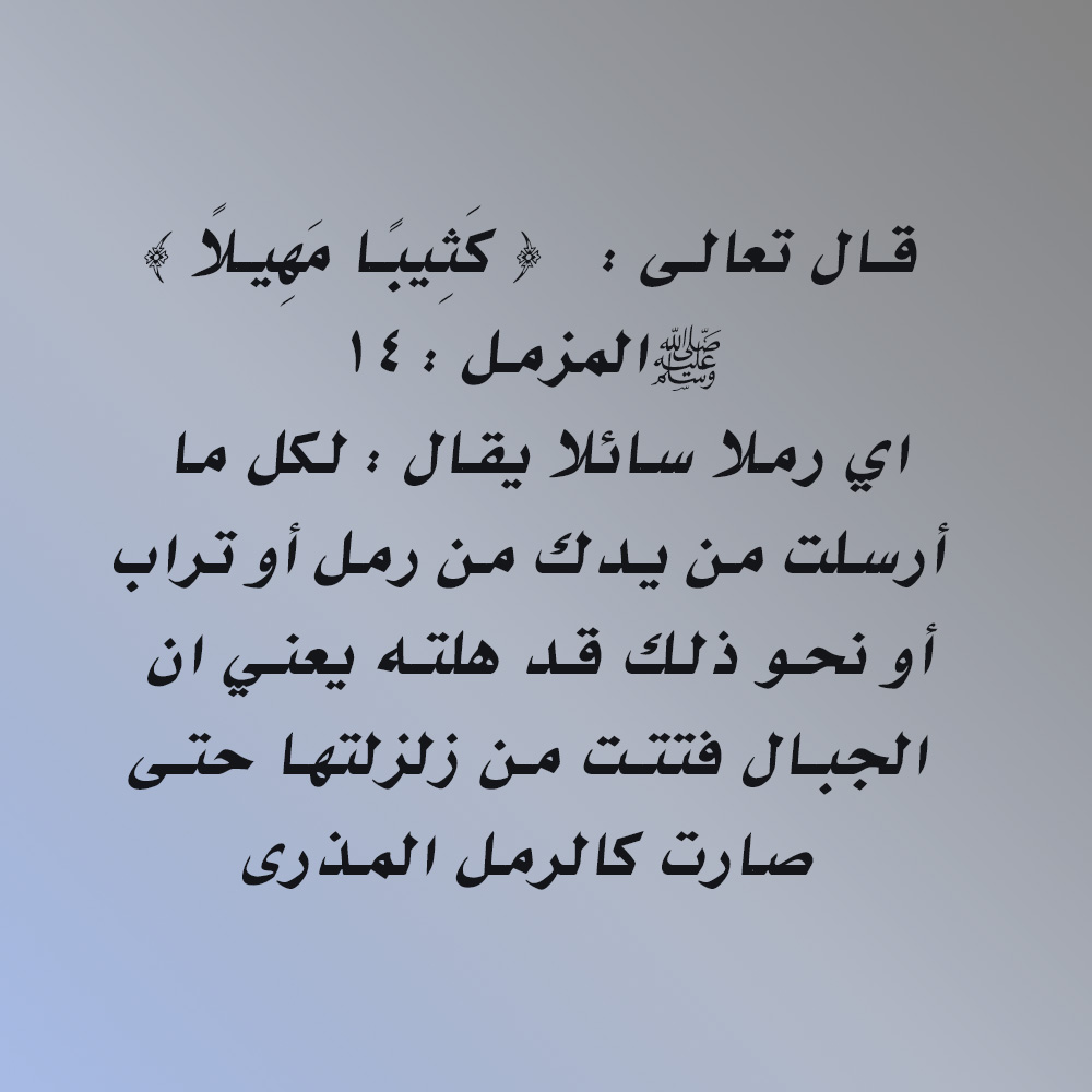 قال تعالى : { كَثِيبًا مَهِيلًا } [المزمل : 14] رملا سائلا يقال : لكل ما أرسلت من يدك من رمل أو تراب أو نحو ذلك قد هلته يعني ان الجبال فتتت من زلزلتها حتى صارت كالرمل المذرى .