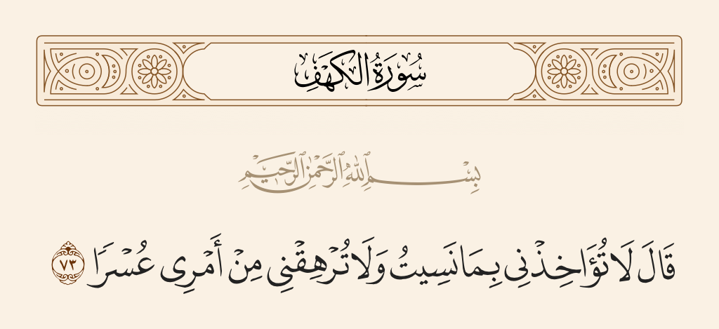 { قَالَ لَا تُؤَاخِذْنِي بِمَا نَسِيتُ وَلَا تُرْهِقْنِي مِنْ أَمْرِي عُسْرًا } . يعني لقد اخطئت ونسيت الوعد فلا تؤاخذني بهذا الإشتباه.
