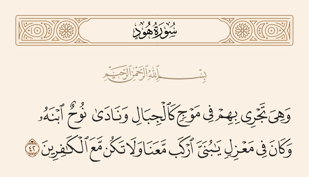 ان شرط الركوب في سفينة نوح عليه السلام الإيمان والعمل الصالح، من هنا فقد عرض نوح على‏ ابنه الإيمان، والانفصال عن الكافرين، والركوب معه ومع أصحابه في السفينة : { يَابُنَيَّ ارْكَبْ مَّعَنَا وَلَا تَكُنْ مَّعَ الكَافِرينَ } . (هود/ 42)