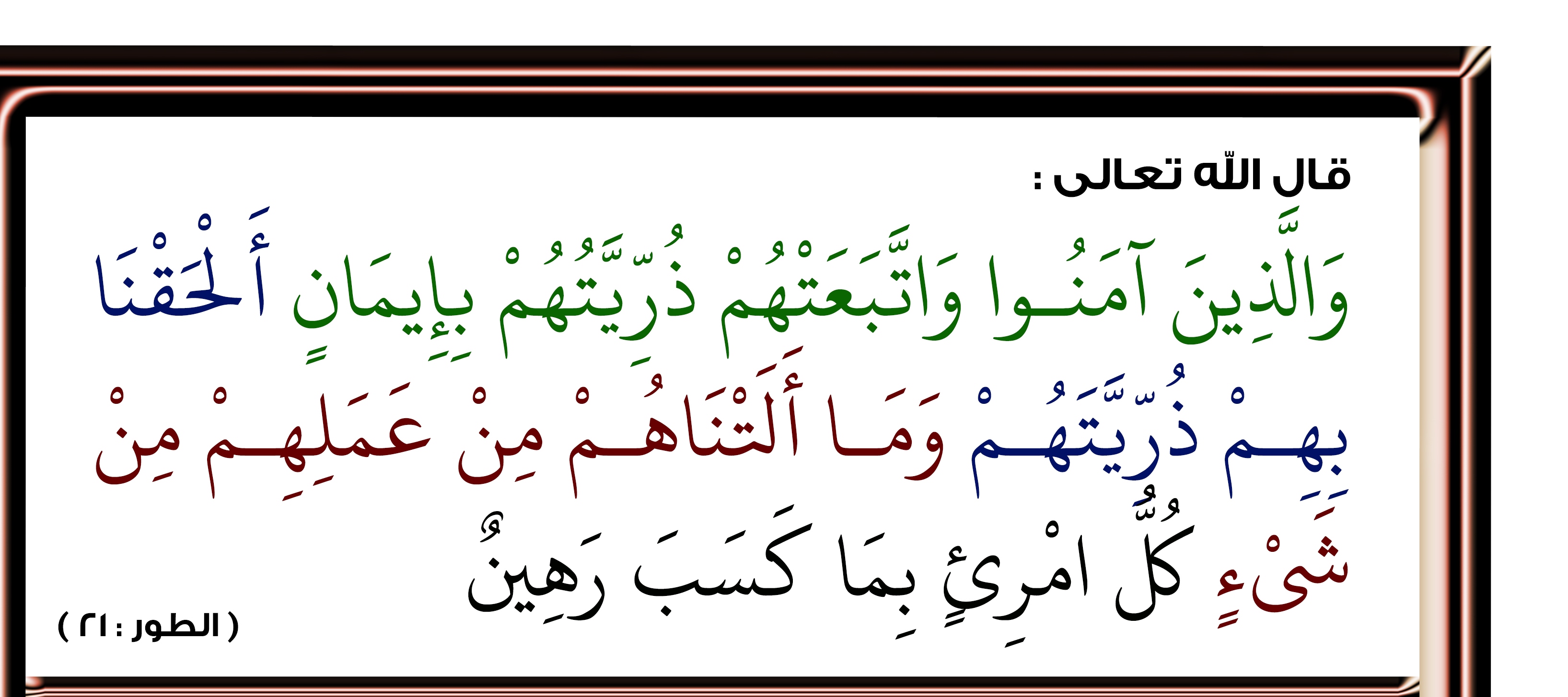 عن ابن عباس في قوله تعالى: {والذين آمنوا واتبعتهم ذريتهم} الآية، قال: نزلت في النبي (صلى الله عليه واله) وعلي وفاطمة والحسن والحسين (عليهم السلام)(1)..
