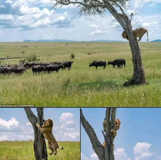 صور قام بالتقاطها مصور نرويجي عام 2021، توثق الصور اللحظة التي أُجبر فيها ملك الغابة على الهرب وصعود شجرة خوفا من قطيع جواميس، يقول المصور مكث الأسد في الشجرة قرابة الساعة، حدث هذا في كينيا.