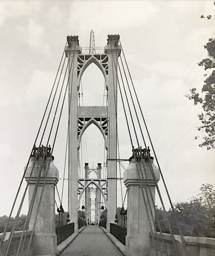 تم تشييد الجسر خلال فترة الانتداب الفرنسي على سوريا في أوائل القرن العشرين، ويتميز بتصميمه المعلق الذي كان متقدماً في تلك الحقبة. يعكس الجسر التقدم الهندسي والابتكار في تصميم الجسور في تلك الفترة، ويُعتبر من الأيقونات المعمارية التي تسهم في تعزيز الهوية الثقافية للمدينة.