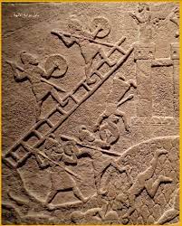 حيث يظهر الجنود الاشوريين وهم يتسلقون السلالم للصعود والوصول الى اعلى القلاع والجدران المرتفعة التي تحيط بالدولة المعادية بعد محاصرتها .. ونرى احد الاعداء اعلى القلعة ، وهو يرفع يده وكانه في حالة تضرع ودعاء لطلب الرحمة ، وهذه اشارة الى هزيمة الاعداء.