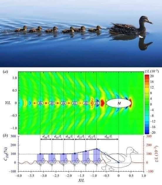 حيث تقوم الأم بكسر التوتر السطحي للماء و خلق موجات دافعة للأبناء عبر ركوب الأمواج و تمريرها للأبناء لخلق سحب موجي و توازن ديناميكي لهم و بالتالي تسهيل عملية السباحة لفراخ البط و تقليل طاقتهم المستهلكة في السباحة .