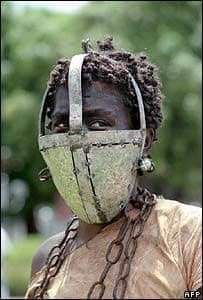 استخدم هذا القناع المعدني اثناء فترة العبودية في قارة افريقيا، لمنع العبيد الافارقة من تناول الفواكه اثناء قطفها ، ولايقافهم من ترديد الاناشيد الروحية والحربية المحفزة، ولايقافهم من تعليم لغتهم لاطفالهم ، حيث دمرت اغلب اللغات المحلية واجبروا على تعلم لغة المستعمرين، وكانوا يجبرون على وضع شئ في افواههم قبل لبس القناع لمنعهم كذلك من التحدث فيما بينهم..