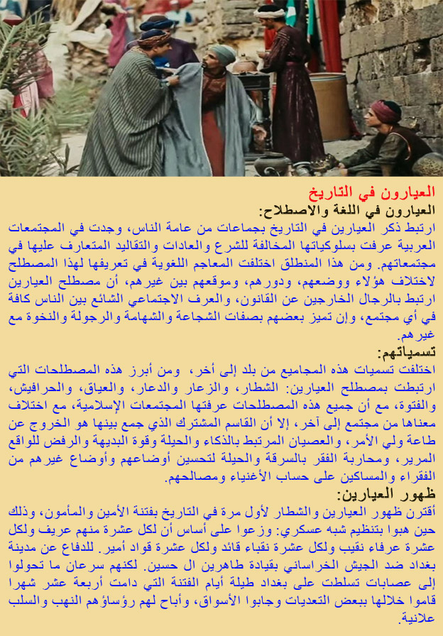 العيارون في التاريخ :: ارتبط ذكر العيارين في التاريخ بجماعات من عامة الناس، وجدت في المجتمعات العربية عرفت بسلوكياتها المخالفة للشرع والعادات والتقاليد المتعارف عليها في مجتمعاتهم.