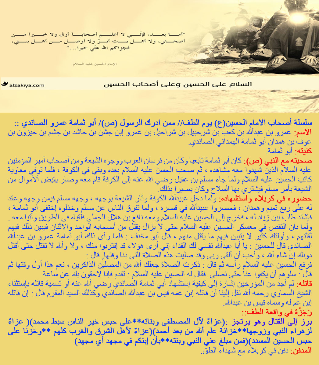سلسلة أصحاب الامام الحسين(ع) يوم الطف// ممن ادرك الرسول (ص)/ عمرو بن عبدألله بن كعب (ابو ثمامه) ::