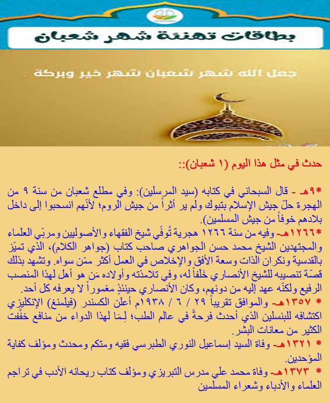 شهر شعبان:: شَعْبَانُ هو الشهرُ الثامنُ من السَّنَةِ القَمَرِيّةِ أو التقويمِ الهِجْرِيّ. كانت تسمية هذا الشهرِ كباقي الشهورِ في عصرِ ما قبلَ الإسلامِ وسُمِّيَ هذا الشهرُ بشعبانَ لتشعب القبائل العربية وافتراقها للحرب بعد قعودها عنها في شهر رجب حيث كانت محرمة عليهم.