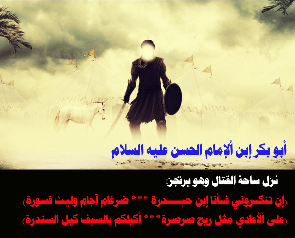 سلسلة أصحاب الامام الحسين(ع) يوم الطف// أبناء الحسن بن علي بن ابي طالب(ع)/ أبو بكر إبن ألإمام الحسن (ع): ذكره المرحوم السيد المقرم وقال: وخرج أبو بكر إبن الحسن إبن أمير المؤمنين عليه السلام وهو عبدألله ألأكبر وأمه أم ولد يقال لها رملة أم القاسم وأبي بكر وعبدألله وفي نسب قريش القاسم وأبو بكر قتلا بالطف ولا عقب لهما. )، ذكره المدائني بإسناد عنه عن أبي مخنف عن سلمان بن أبي راشد : إن عبدألله بن عقبة الغنوي قتله.