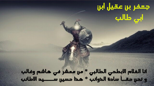 سلسلة أصحاب الامام الحسين(ع) يوم الطف// أبناء عقيل بن ابي طالب(رض)/ جعفر بن عقيل: جعفر بن عقيل بن ابي طالب،،امه هي أم الثغربنت عامربن الهصان العامري، وقيل أن أمه هي أم البنين ابنة الشقربن الهضباب،،زوجته بنت امير المؤمنين (ع)،،حضوره في كربلاء واستشهاده:: يقول صاحب الفتوح: فخرج بعده – أي: بعد عبد الله بن مسلم - جعفر بن عقيل بن ابي طالب، وفي المناقب ورد: حمل على جيش عمر بن سعد، فقتل رجلين، وفي قول خمسة عشر فارساً،، قتله بشر بن حوط الهمداني وقيل عروة بن عبد الله الخثعمي،، وله 23 سنة يوم استشهاده.
