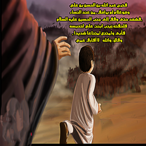 سلسلة أصحاب الامام الحسين(ع) يوم الطف// أبناء الحسن بن علي بن ابي طالب(ع)/ عبدألله بن الحسن بن ألإمام الحسن (ع):عبدالله بن الحسن بن علي بن أبي طالب، من أبناء الإمام الحسن المجتبى (ع)، كان مع عمّه الحسين (ع) في واقعة كربلاء. من الصبيان الذين استشهدوا، ولم يبلغوا الحلم، فكانت زينب (ع) قد حبسته، فأفلت منها نحو مصرع عمه، فقطع بحر بن كعب يده، ورماه حرملة، فـاستشهد في حجر عمه، قُبيل مقتل الإمام الحسين(ع).