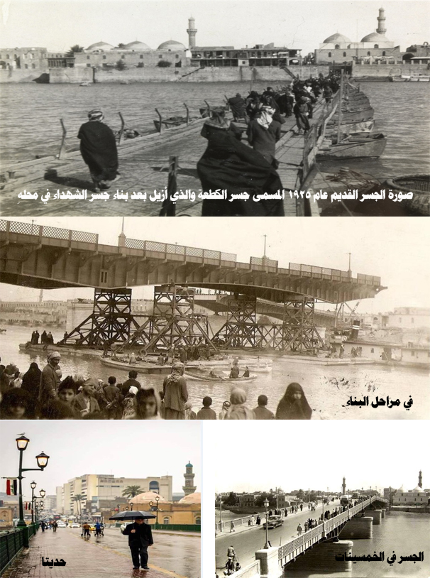 جسر الشهداء: جسر يربط منطقتي الرصافة والكرخ في بغداد بدأ العمل بالجسر في 1937 وافتتح في 15/7/1393 أطلق عليه قديماً "جسر الملكة عالية" ثم "جسر المأمون" أو "الجسر العتيق"، ثم سمي بجسر الشهداء بعد الانقلاب العسكري الذي أدى إلى قيام الجمهورية العراقية عام 1958 تخليداً للشهداء الذين أطلقت عليهم الشرطة في زمن الحكومة الملكية الرصاص وسقطوا من على هذا الجسر اثناء التظاهرات بلغ طول الجسر 214 م وعرضه 15م وله 4 ركائز مائية وكان سبب هذه المظاهرات هو التنديد…