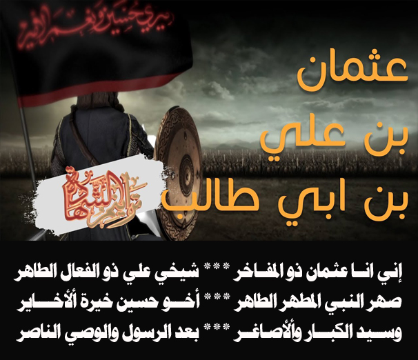 سلسلة أصحاب الامام الحسين(ع) يوم الطف// أبناء علي بن ابي طالب(ع)/ عثمان بن علي::عثمان بن علي بن أبي طالب امه فاطمة بنت حِزام سليلة الشجاعة والنجابة والكرم، ام البنين سلام الله عليها. حضوره في كربلاء واستشهاده: برز للقتال بعد أخيه عبد ألله وقاتل قتال ألأبطال المستميتين. لا تأخذه في ألله لومة لائم وأخذ يضرب فيهم حتى قتل منهم أحد عشر رجلا غير من جرح، كان عمره يوم الطف إحدى وعشرين سنة وقيل ثلاث وعشرين سنة دفن في كربلاء مع الشهداء.قاتله: رماه اللعين خولي بن يزيد ألأصبحي بسهم فقتله وإحتز رأسه الشريف.