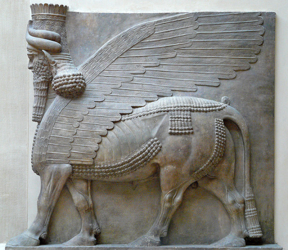 الثور المجنح: ويسمى أيضاً شيدو لاموسو كما ورد في الكتابات الآشورية وكان هذا الاسم يستعمل لأنثى من الجن مهمتها حماية المدن والقصور ودور العبادة هو تمثال ضخم يبلغ طوله 4.42 م ويزن أكثر من 30 طناً.وهو فرداً من زوج يحرس باباً من أبواب سور مدينة(دور شروكين)التي شيدها الملك الاشوري سرجون الثاني (721- 705 ق.م) والتي هجرها سنحاريب بن سرجون الثاني، حيث نقل العاصمة إلى مدينة نينوى. كان يرمز إلى القوة والحكمة والشجاعة والسمو ويعتقد بأن الآشوريين القدماء قد عبدوا الثور المجنح ولكن العلماء نفوا هذا الاعتقاد.