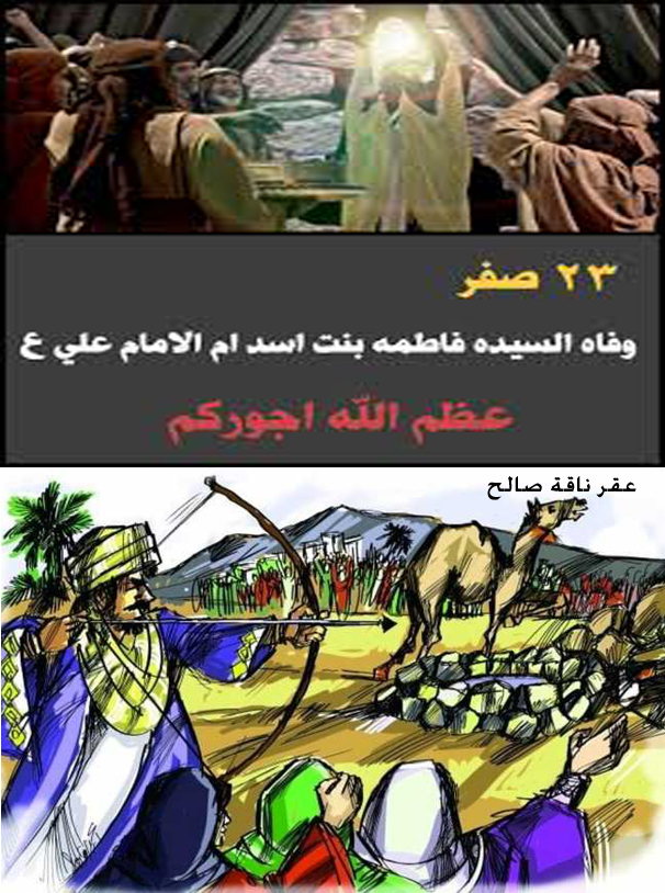 حدث في مثل هذا اليوم(10/11)(23صفر)::(في هذا اليوم عقرت ناقة صالح (ع)(4هـ - فاطمة بنت أسد بن هاشم وهي أم أمير المؤمنين علي بن ابي طالب (ع). كانت ممن أسلم قديماً، وروت عن النبي (ص) 46 حديثاً، وكانت ذات صلاح ودين، فكان رسول الله (ص) يزورها ويقيل في بيتها، ويحترمها احتراماً عظيماً. ولما توفيت بالمدينة حزن عليها رسول الله، وحفر لحدها بيده، وامتد فيه، وألبسها قميصه في أكفانها. ولما قيل لرسول الله (ص)ما رأيناك صنعت بأحد مثل ما صنعت بهذه المرأة؟ قال: «إنه لم يكن أحد بعد أبي طالب أبرَّ بي منها.....).