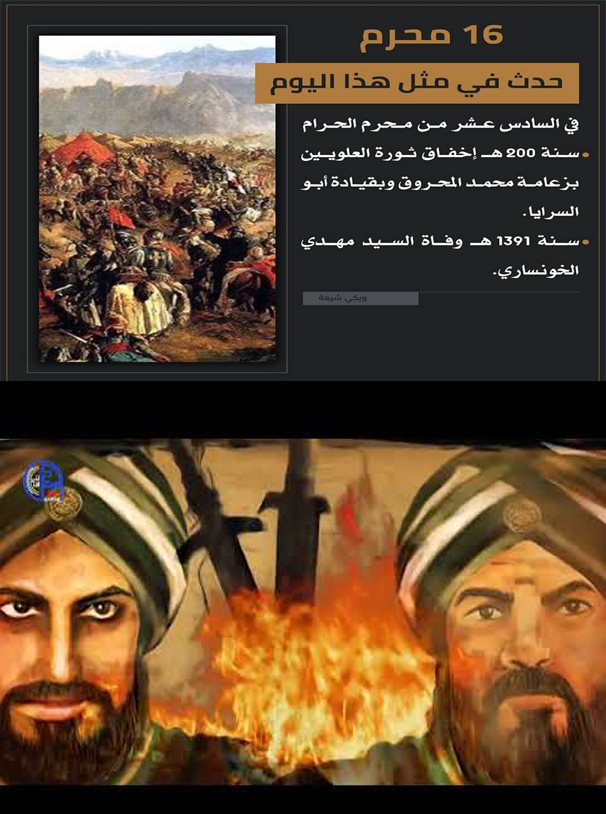 حدث في مثل هذا اليوم(16 محرم)::(64هـ - وقع القتال بين الحصين بن نمير رئيس جيش يزيد بن معاوية، وبين عبد الله بن الزبير بمكة المكرمة، ولا زال القتال مستمراً بين الفريقين إلى أن جاءهم خبر هلاك يزيد بن معاوية، فتراجعوا عن قتال ابن الزبير)(200 هـ - إخفاق ثورة العلويين بزعامة محمد المحروق وبقيادة أبو السرايا)(1391 هـ - وفاة السيد مهدي الخونساري).