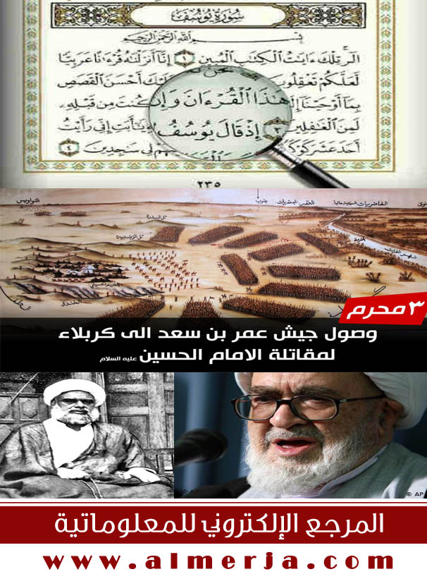 (محرم الحرام أول شهر من أشهر السنة الهجرية حسب ما هو شائع، وسمي بالمحرم نحو عام 412 م في عهد كلاب بن مرة الجد الخامس للنبي محمد صلى الله عليه وآله وسلم، وذلك لحرمة القتال فيه عند العرب، ومن أهم الأحداث التي وقعت فيه واقعة كربلاء التي استشهد فيها الإمام الحسين(ع)وأصحابه، وفي كل عام يقوم الشيعة بنصب العزاء فيه من أجل مواساة أهل البيت في أحزانهم) (61هـ- نزل إلإمام الحسين (ع) بقصربني مقاتل)(1235هـ- ولادة علي محمد رضا الشيرازي)(1405هـ - وفاة السيد عبد الله الشيرازي).