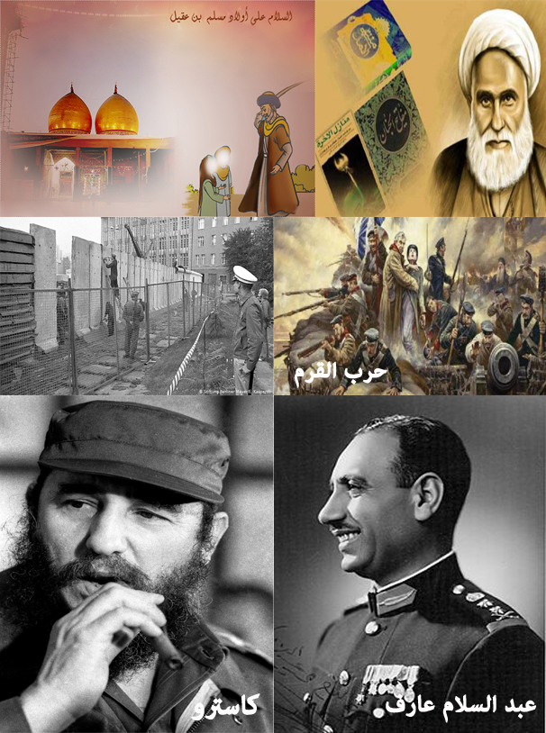 حدث في مثل هذا اليوم(8/13)(23ذوالحجة)::(66 هـ - تحرك قوات المختار الثقفي من الكوفة بقيادة إبراهيم بن مالك الأشتر)(1385هـ - سقوط طائرة مروحية تقل الرئيس العراقي عبد السلام عارف (1413هـ - إعادة انتخاب الرئيس الإيراني هاشمي رفسنجاني لفترة رئاسية ثانية)(1787 -الدولة العثمانية تعلن الحرب على روسيا بسبب شبه جزيرة القرم)(1913- اختراع مادة الستاينليس)(1961 - إغلاق الحدود بين الألمانيتين وبدأ بناء جدار برلين)(1926 - ولادة فيدل كاسترو)(62هـ - مقتل ولدي مسلم بن عقيل إبراهيم ومحمد)(1359هـ الشيخ عباس القمي).