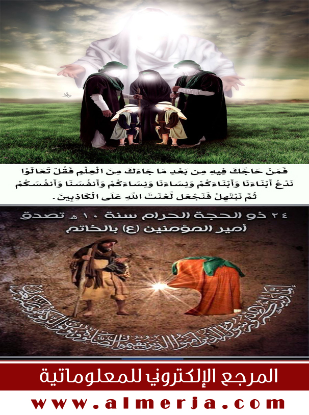 حدث في مثل هذا اليوم(24 ذو الحجة)::(9 هـ - خرج النبي (ص) بعلي وفاطمة وولديهما الحسن والحسين (عليهم السلام) إلى مباهلة نصارى نجران وبذلك تمثلت النفس المذكورة في الآية الكريمة في علي (عليه السلام)(9 هـ - نزول آية المباهلة وآية التطهير على النبي (ص))(9/10 هـ - وفي هذا اليوم المبارك تصدَّق أمير المؤمنين علي بن أبي طالب (ع) بخاتمه على السائل ـ وهو راكع ـ فأنزل الله فيه: ﴿إِنَّمَا وَلِيُّكُمُ اللّهُ وَرَسُولُهُ وَالَّذِينَ آمَنُواْ الَّذِينَ يُقِيمُونَالصَّلاَةَ وَيُؤْتُونَ ....).