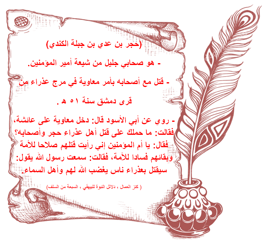 - روي عن أبي الأسود قال: دخل معاوية على عائشة، فقالت: ما حملك على قتل أهل عذراء حجر وأصحابه؟ فقال: يا أم المؤمنين إني رأيت قتلهم صلاحا للأمة وبقائهم فسادا للأمة، فقالت: سمعت رسول الله يقول: سيقتل بعذراء ناس يغضب الله لهم وأهل السماء.
