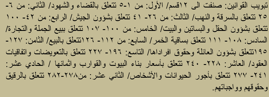 اقسام قانون حمورابي: قسم حمورابي قانونه الى 12 قسم وقد تناول ادق التفاصيل والمفاصل الاجتماعيه وسنعرض لكم هذا القانون وما تناوله تباعا ان شاء الله... ولكم الحكم .