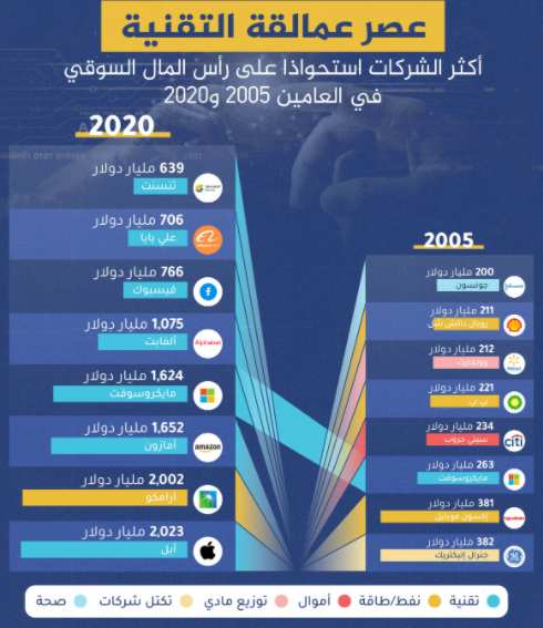 اكثر الشركات استحواذاً على رأس المال السوقـي في العامين 2005 و 2020 ؟!