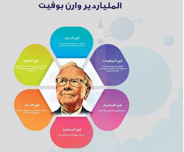 نصائح الملياردير وارن بوفيت لمستقبل مالي ناجح : 1ـ الدخل : لا تعتمد على وسيلة دخل واحدة ؛ استثمر لتخلق مصدراً آخر للدخل ،2ـ الانفاق : اذا كنت تشتري ما لاتحتاجه فسيأتي عليك الوقت الذي تضطر فيه لبيع ماتحتاجه ، 3ـ الادخار: لا تدخر ما يتبقى بعد الانفاق بل انفق ما تبقى بعد الادخار ،4ـ المخاطرة : لا تختبر عمق النهر بكلا القدمين ، 5ـ في الاستثمار : لا تضع البيض كله في سلة واحدة ، 6 ـ في التوقعات : الامانة هي هبة غالية جدا لا تتوقع ان ستكون موجودة في الناس الرخيصة .