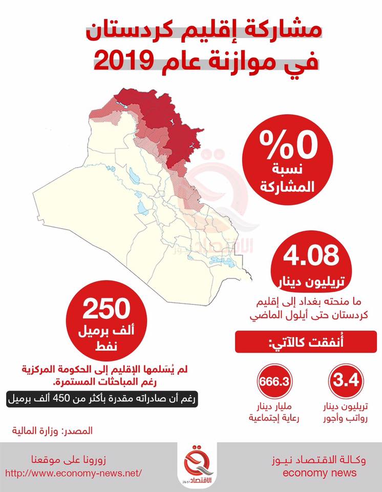 مشاركة اقليم كردستان في موازنة عام 2019 : 0% نسبة المشاركة ! ، 4,08 تريليون دينار ما منحته بغداد الى اقليم كردستان حتى ايلول الماضي كنفقات منها رواتب واجور ورعاية اجتماعية ، بينما في المقابل 250 الف برميل نفط لم يسلمها الاقليم الى الحكومة المركزية رغم مباحثات مستمرة ورغم صادراته المقدرة بأكثر من 450 الف برميل ...