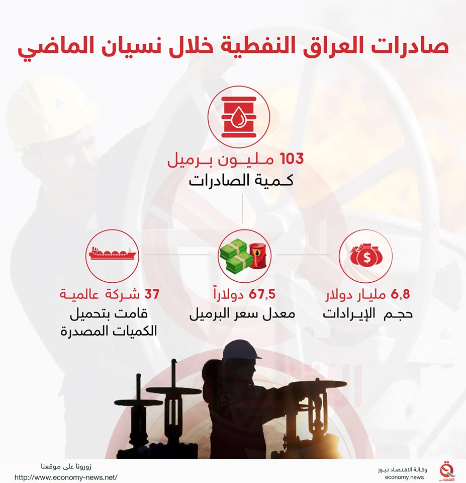 صادرات العراق النفطية خلال شهر نيسان الماضي : 103 مليون برميل كمية الصادرات ، 6,8 مليار دولار حجم الايرادات ، 67,5