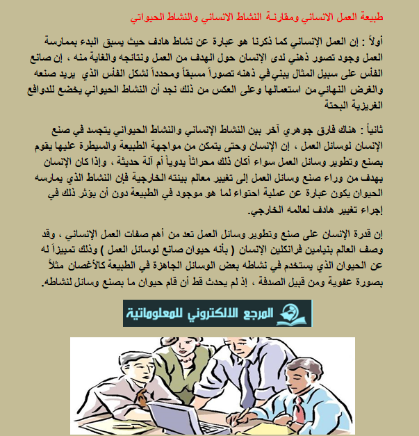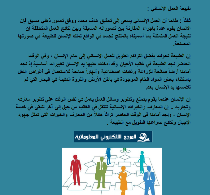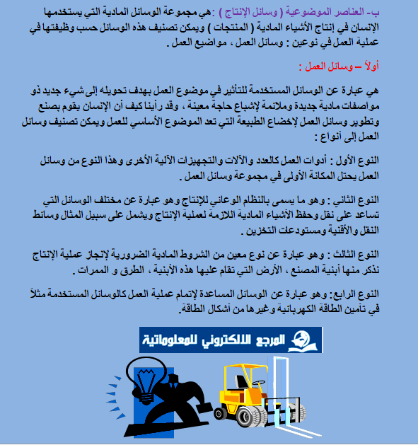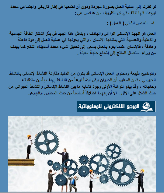عناصرالعمل والانتاج 2 : وفضلاً عن ذلك فإن هذه السلوكية العفوية والغريزية في استخدام الحيوان لبعض الوسائل الجاهزة في الطبيعة لا تمارس أي تأثير على تطوره وارتقاءه لأن عملية التحويل والارتقاء الحيواني تخضع لقوانين التطور الطبيعي الخاصة بهذه العملية بينما يعد صنع وتطوير وسائل العمل من قبل الإنسان أساس ارتقائه وارتقاء المجتمع ، إن التطور الاجتماعي يقاس أساساً بمستوى تطور وسائل العمل وتطور المكتشفات العلمية والتكنيكية .