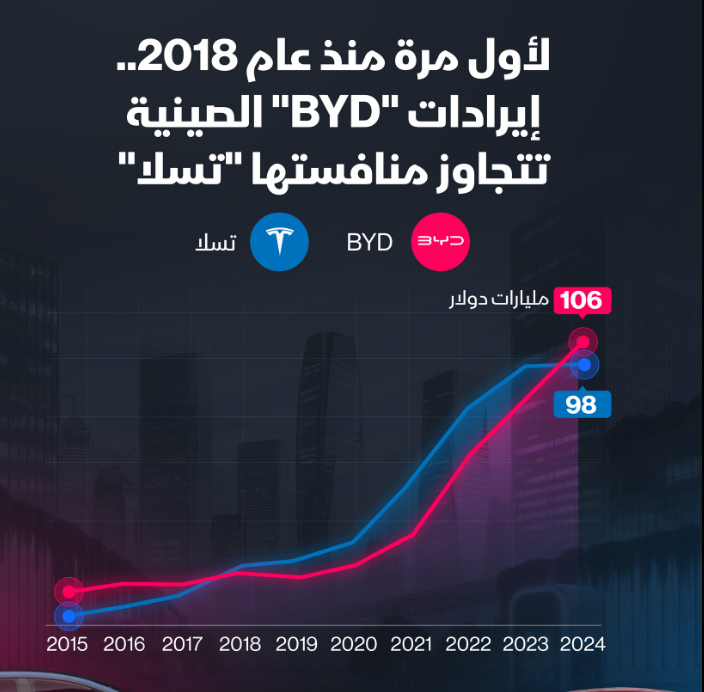 بعد 6 سنوات من تفوق "#تسلا".. إيرادات "BYD" الصينية تتجاوز منافستها بعد أن بلغت 106 مليارات دولار في 2024.