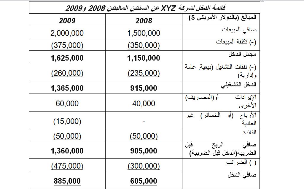 كشف الدخل Income Statement : يعرف بأنه تقرير مالي يبين ربحية المنظمة خلال فترة معينة من الزمن مثل شهر أو فصل أو سنة ويسمى ايضاً حساب الارباح والخسائر, حيث يتم ذلك من خلال المعادلة التالية صافي الربح (الربح أو الخسارة)= الايرادات ـــ المصاريف . وتعد عملية كشف الدخل تقييم للاداء السابق لاي شركة أو منظمة واساساً للتنبؤ بالاداء المستقبلي , والكشوفات المالية تعتبر من المناهج المهمة للمحافظة على رأس المال في أي منظمة . اعلاه مثال عن قائمة الدخل لشركة ما تبين كشف الدخل لاعمالها .