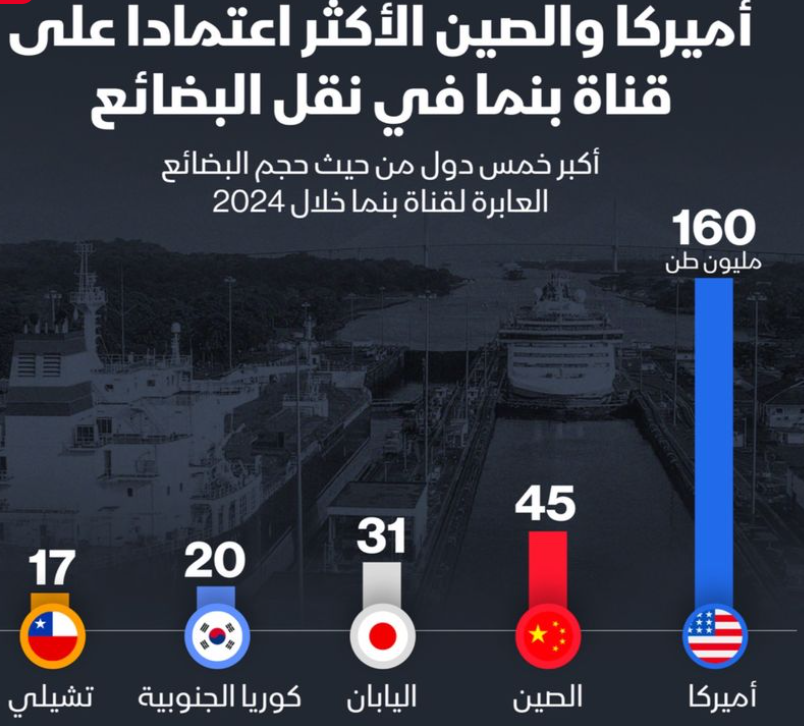 كرر الرئيس الامريكي المُنتخب دونالد ترامب تهديده الذي أطلقه قبل يوم التنصيب بإعادة فرض السيطرة الأميركية على القناة، قناة بنما هي ممر مائي اصطناعي طوله 82 كيلومتراً يربط بين المحيطين الهادئ والأطلسي عبر بنما، قناة بنما مسؤولة عن قرابة 6% من حركة التجارة العالمية، حيث تبلغ قيمة البضائع التي تعبر القناة حوالي 270 مليار دولار سنوياً ، كما تُعد الولايات المتحدة أكثر الدول اعتماداً على القناة. ففي عام 2024 عبرت القناة شحنات باتجاه أميركا بحجم 160 مليون طن، تليها الصين مباشرة بـ45 مليون طن .