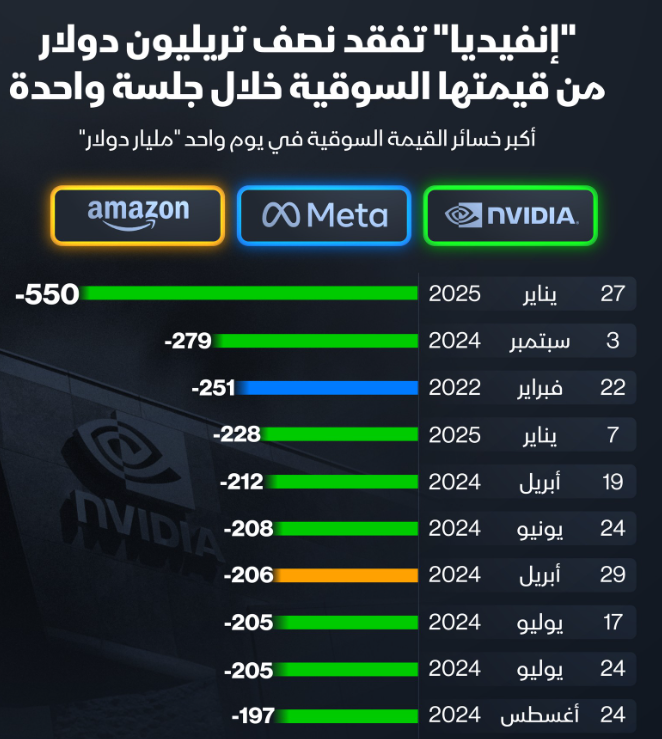 #إنفيديا تفقد نحو نصف تريليون دولار من قيمتها السوقية ، في أكبر خسائر يومية للقيمة السوقية، وذلك على خلفية ما أحدثة نموذج الذكاء الاصطناعي الصيني #DeepSeek من ذعر في قطاع التكنولوجيا الأميركي خلال جلسة امس.
