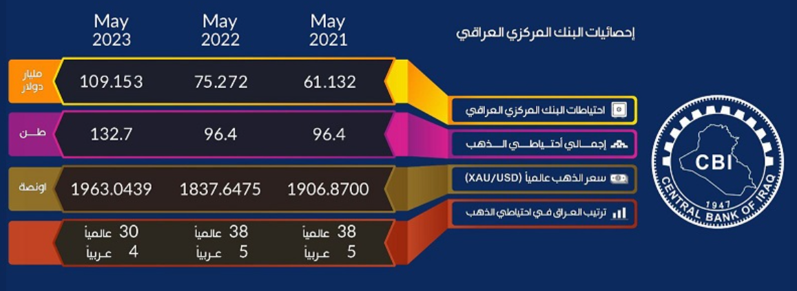العراق الثالث عربيا في احتياطيات النقد الأجنبي: وعلى الرغم من انخفاض الاحتياطيات النقدية الأجنبية في البنك المركزي العراقي من 109.153 مليار دولار عام 2023 الى 106.7 مليار دولار عام 2024 إلا ان العراق يأتي في المرتبة الثالثة عربيا عام 2024 بعد السعودية (499) مليار دولار والامارات (210) مليار دولار.تمتلك البنوك المركزية الاحتياطيات النقدية الأجنبية للأسباب عديدة : ـ المساعدة في الحفاظ على قيمة العملة المحلية بسعر ثابت. ــ الحفاظ على السيولة. ــ الوفاء بالالتزامات المالية الدولية للدولة..