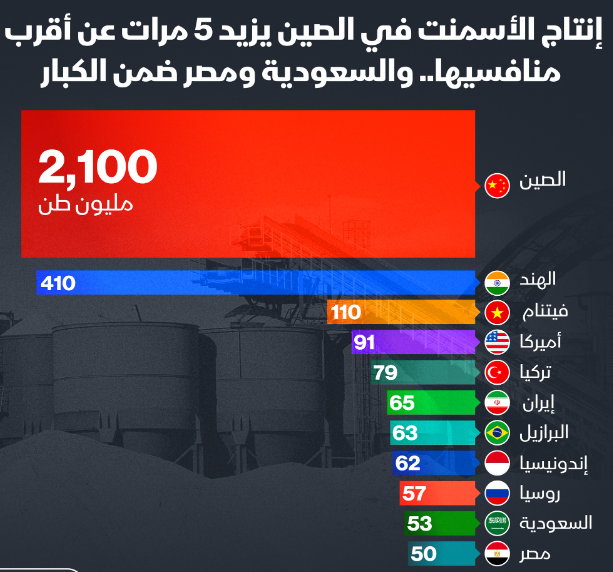 في عام 2023 تفوقّت #الصين بإنتاج الأسمنت 5 مرات عن أقرب منافسيها.. فيما تصدرت #السعودية و #مصر الإنتاج عربياً.