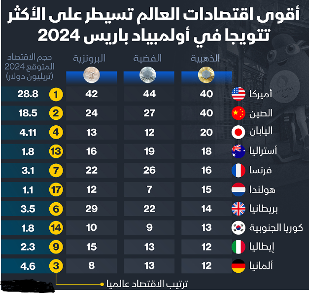 الاقتصادات الأكبر عالمياً تصدرت قائمة التتويج بميداليات أولمبياد باريس 2024.