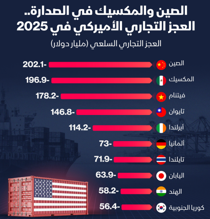 العجز التجاري الأميركي في 2025.. الصين والمكسيك وفيتنام في الصدارة ..