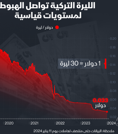 جاء التراجع الذي شهدته العملة التركية بعد أن رفعت الحكومة الحد الأدنى لصافي الأجور لعام 2024 إلى 17 ألف ليرة (578 دولاراً) لتخفيف تكاليف المعيشة، والذي يُتوقع أن يؤجج معدلات التضخم.