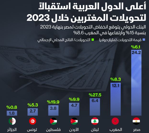 #مصر و #المغرب في صدارة القائمة.. تعرف على أعلى الدول العربية استقبالاً لتحويلات المغتربين خلال 2023 .