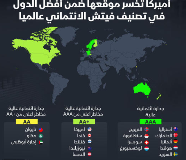 أعلنت وكالة فيتش الثلاثاء، في بيان خفض درجة الولايات المتحدة للتصنيف الائتماني من "AAA" إلى "إAA+". وقالت الوكالة إن هذه الخطوة تعكس "التدهور المتوقع للمالية العامة خلال السنوات الثلاث المقبلة، والعبء المرتفع والمتزايد للدين العام الحكومي، وتآكل الحوكمة". وأعلن البيت الأبيض، أنه يرفض "بشدة" القرار مشيرا إلى أن الرئيس جو بايدن حقق أقوى تعاف اقتصادي بين كل الاقتصادات في العالم.