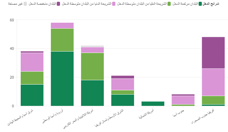 شهد تصنيف البلدان إلى شرائح دخل تطوراً كبيراً على مدى الفترة الماضية ومنذ أواخر الثمانينيات. وفي عام 1987، تم تصنيف 30% من البلدان المبلغة على أنها منخفضة الدخل، بينما لم تدخل ضمن هذا التصنيف سوى 12% منها في عام 2022. ويختلف مدى هذا الانخفاض بين مناطق العالم، حيث انخفضت نسبة البلدان منخفضة الدخل في منطقة أفريقيا جنوب الصحراء من 74% إلى 46% في عام 2022، وفي منطقة شرق آسيا والمحيط الهادئ من 26% إلى 3%، وفي منطقة جنوب آسيا من 100% إلى 13% حيث انتقلت الاقتصادات إلى فئات أعلى خلال هذه الفترة.