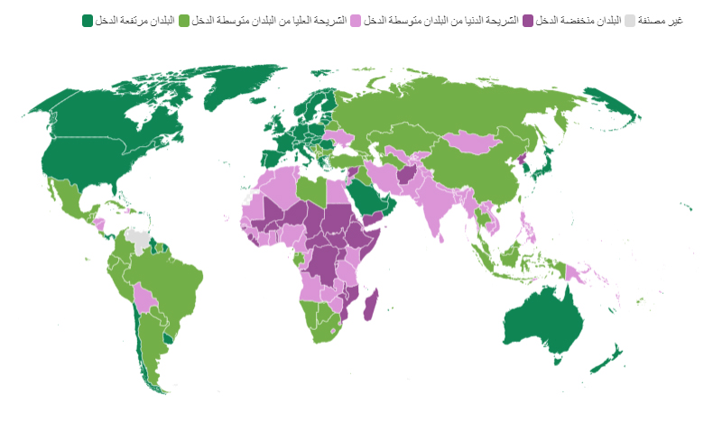 تصنف مجموعة البنك الدولي اقتصادات العالم إلى أربع مجموعات للدخل وهي:البلدان منخفضة الدخل،والشريحة الدنيا من البلدان متوسطة الدخل،والشريحة العليا من البلدان متوسطة الدخل،والبلدان مرتفعة الدخل.ويتم تحديث هذه التصنيفات في الأول من يوليو/تموز من كل عام،استنادا إلى نصيب الفرد من إجمالي الدخل القومي في السنة الميلادية السابقة.محسوبة بالدولار الأمريكي باستخدام عوامل تحويل مشتقة حسب طريقة أطلس التي بدأ العمل بها في شكلها الحالي عام 1989لحساب نصيب الفرد من إجمالي الدخل القومي كونه مؤشر للقدرة الاقتصادية.