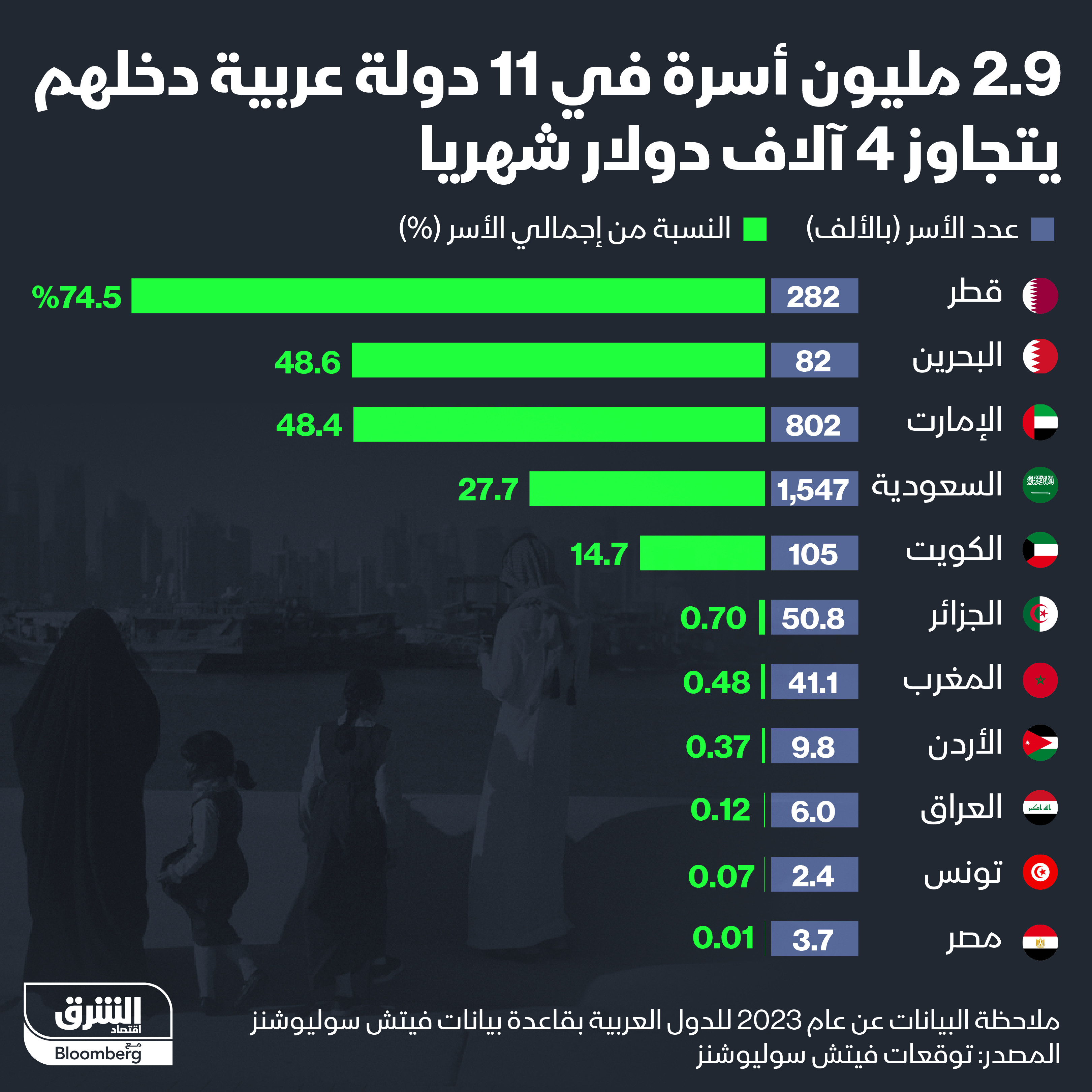 يوجد نحو 2.9 مليون أسرة في الدول العربية يتجاوز دخلها حاجز 4 آلاف دولار شهرياً. وتشكّل هذه الأسر 74% من الأسر المُقيمة في قطر بعدد 282 ألف أسرة، و48.6% من الأسر في البحرين بعدد 82 ألف أسرة، و48.6% من الأسر في الإمارات. بينما تشكّل هذه الأسر نسبة لا تتجاوز 0.1% من الأسر المقيمة في مصر.