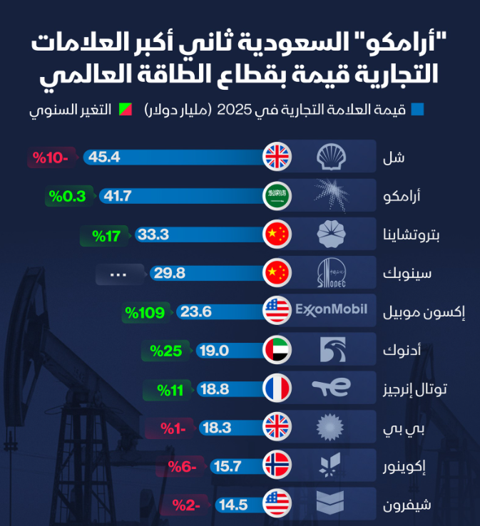 #أرامكو #السعودية ثاني أكبر العلامات التجارية قيمة بقطاع الطاقة العالمي بنحو 41.7 مليار دولار.